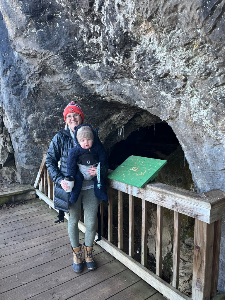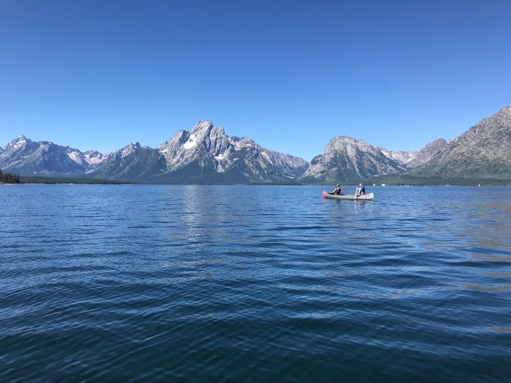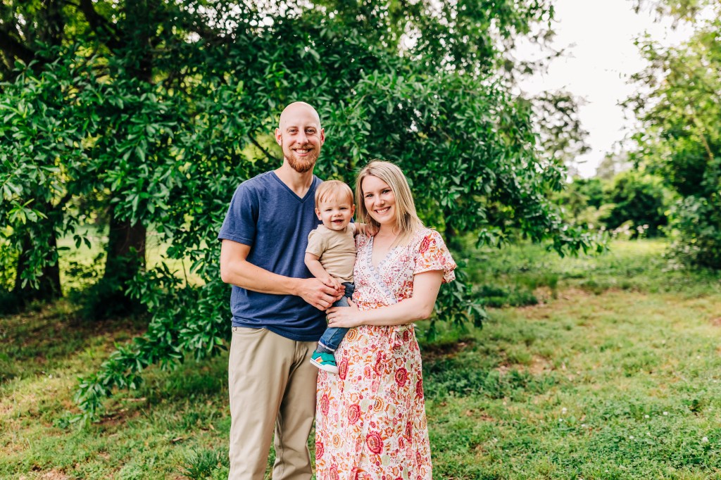 Top left photo: Kayaking with a friend at the Grand Tetons; top right photo: My child, Jordy, on a hike in Ijams State Park; bottom left photo: My spouse and I with our child Jordy at the Knoxville Botanical Gardens; bottom right photo: My spouse and I with our full extended families at our wedding.